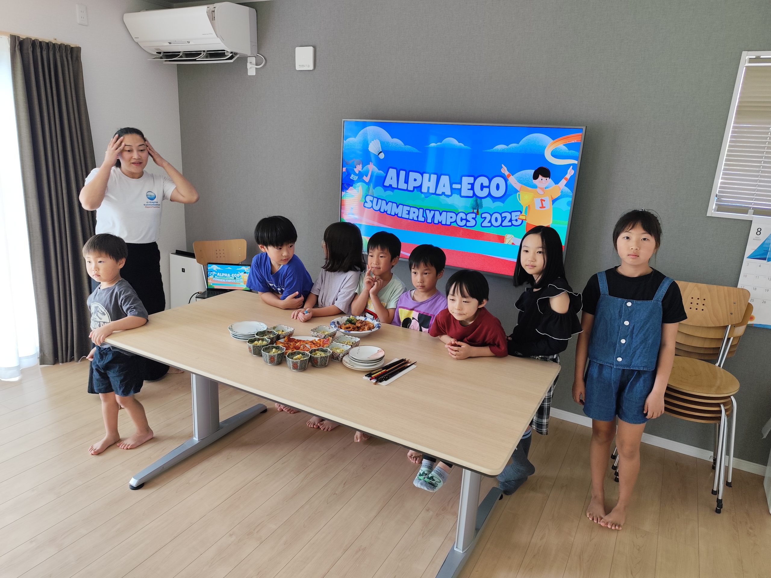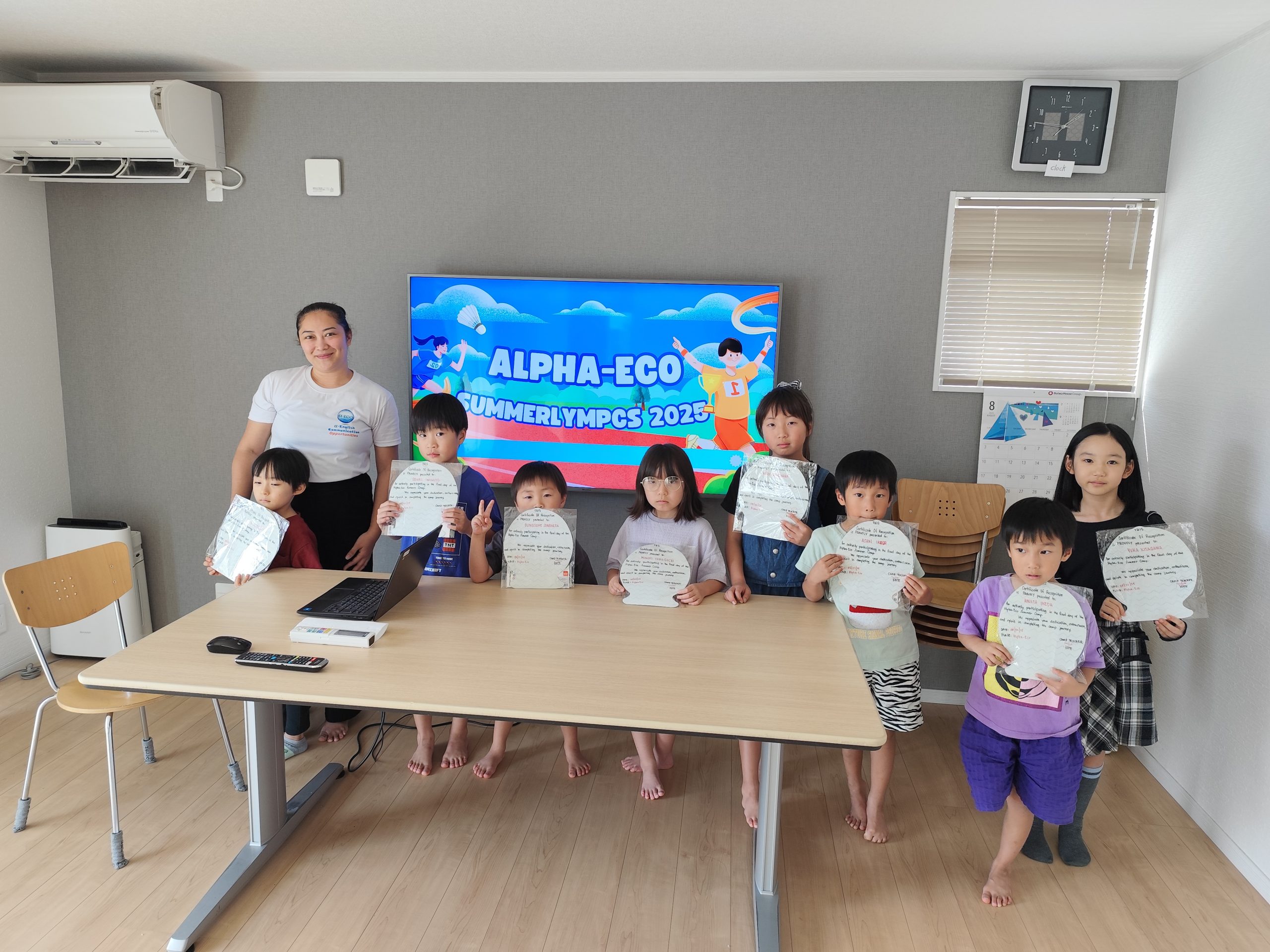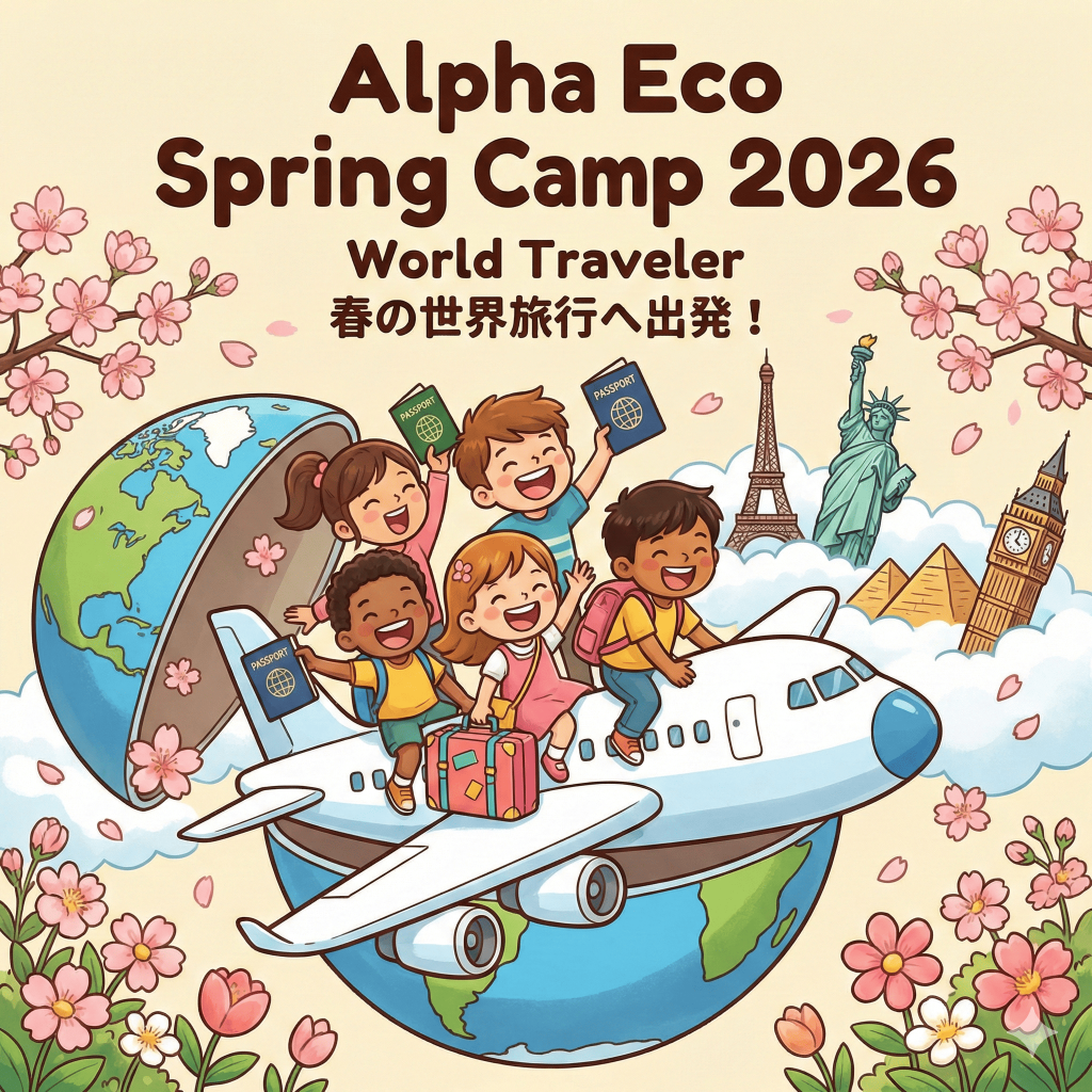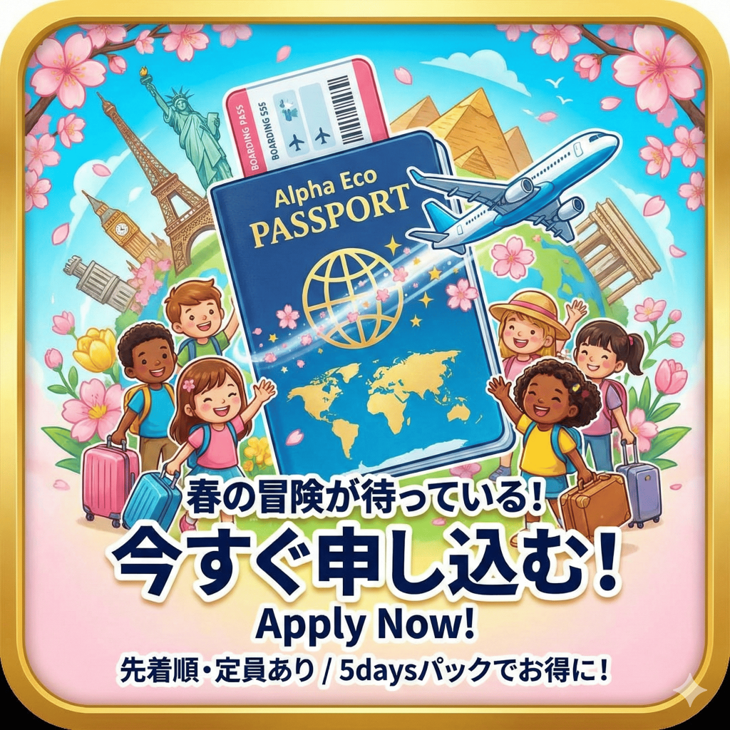 世界の都市名が書かれた看板や地図で空港のように装飾された教室で、手作りのパスポートを持って笑顔で並ぶ子供たちのイラスト。テキスト:「毎日が新しい国への「出発日」! Alpha Eco Spring Camp “World Traveler” 3月26日~4月8日 アルファエコの教室が世界各国の「空港」や「観光地」に大変身します。子供たちは自分だけの「DIYキャンプパスポート」を手に、毎日違う国を訪れます。その国の言葉で挨拶し、伝統的なクラフトを作り、異文化を肌で感じる体験。教科書だけでは学べない「生きた英語」と「国際感覚」を、楽しみながら身につけましょう!」