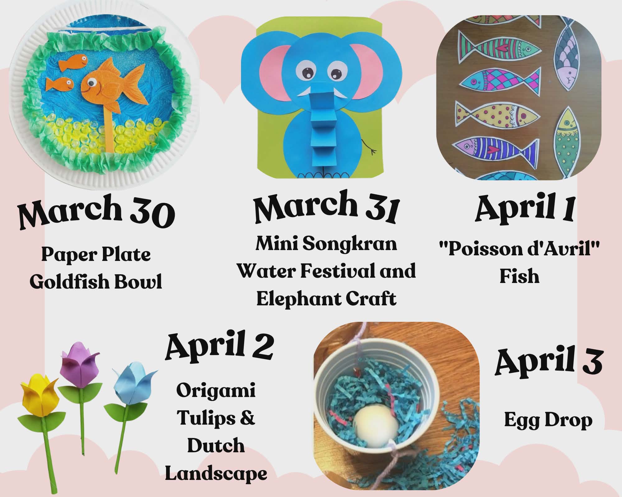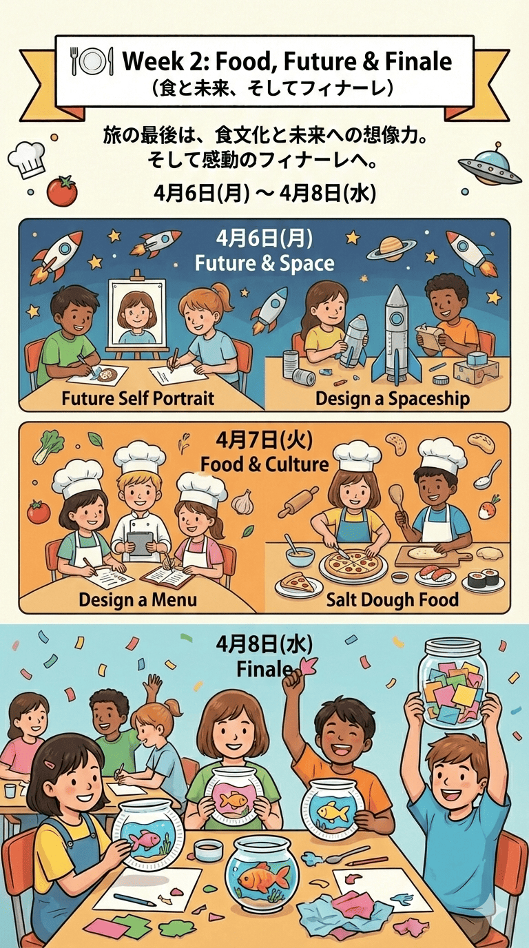 Spring Camp Week 2の案内。タイトル「Week 2: Food, Future & Finale(食と未来、そしてフィナーレ)」、日程「4月6日(月) ~ 4月8日(水)」。ハイライトとして、子供たちがバルコニーから卵を守る装置を落として歓声を上げているイラスト「The Great Egg Drop Challenge 金曜日のスペシャルイベント!」と、子供たちが紙皿で作った金魚鉢を掲げているイラスト「Paperplate Goldfish Bowls: 創造力を膨らませるクラフトタイム。」が描かれている。