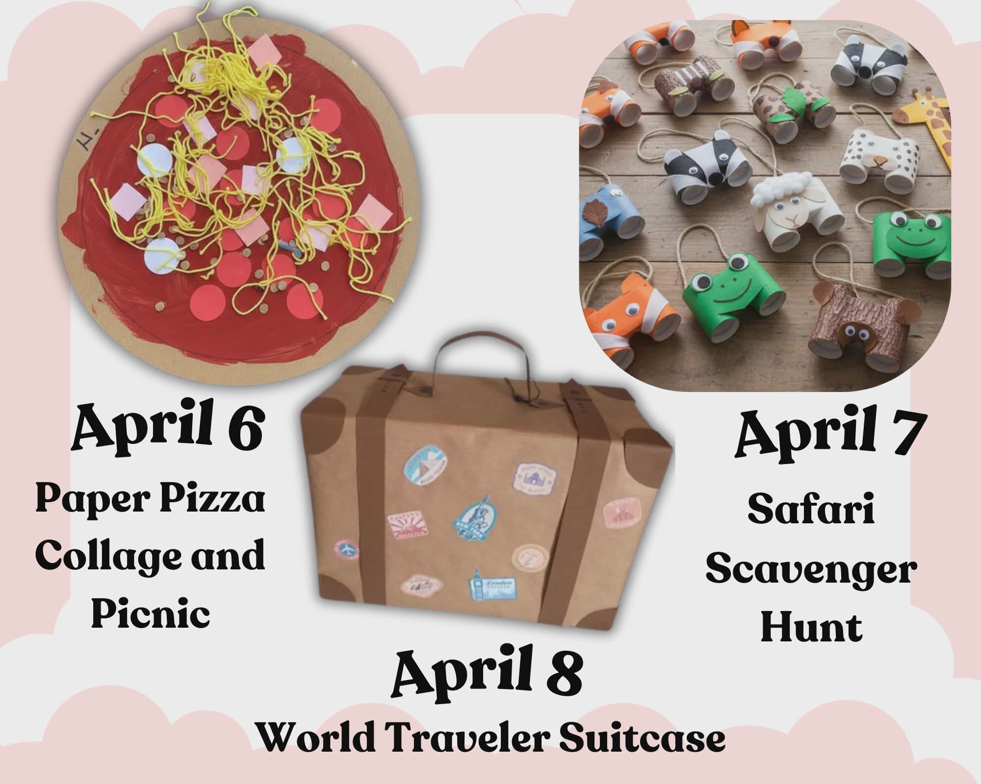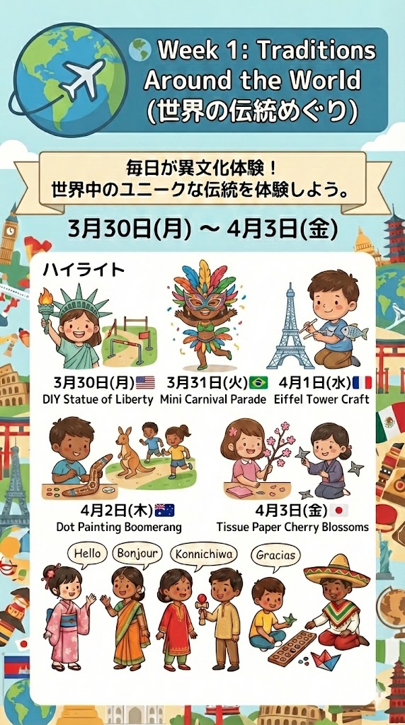 Spring Camp Week 1の案内。タイトル「Week 1: Traditions Around the World(世界の伝統めぐり)」、日程「3月30日(月) ~ 4月3日(金)」。ハイライトとして、子供たちが大きなスーツケースにステッカーを貼っているイラスト「World Traveler Suitcase: 世界を旅するスーツケースをデコレーション!」と、様々な国の民族衣装を着た子供たちが「Hello」「Bonjour」「Konnichiwa」「Gracias」と挨拶したり、けん玉やマンカラで遊んでいるイラスト「Global Customs: 各国の「こんにちは」「ありがとう」を学びながら、その国ならではの遊びに挑戦。」が描かれている。
