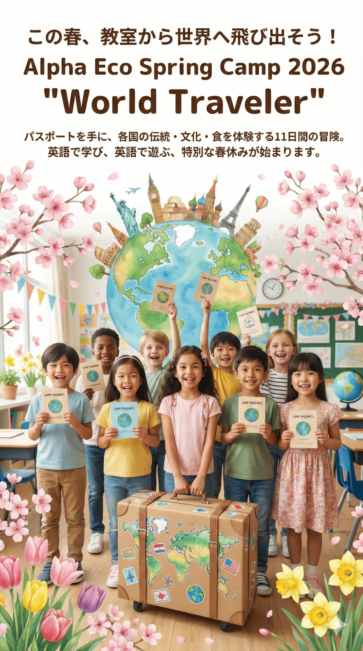 桜の花が咲く中、手作りのパスポートやスーツケースを持ち、笑顔で地球儀を囲む子供たちの写真とイラスト。背景には自由の女神やエッフェル塔などの世界の名所が描かれている。テキスト:「この春、教室から世界へ飛び出そう! Alpha Eco Spring Camp 2026 "World Traveler" パスポートを手に、各国の伝統・文化・食を体験する10日間の冒険。英語で学び、英語で遊ぶ、特別な春休みが始まります。