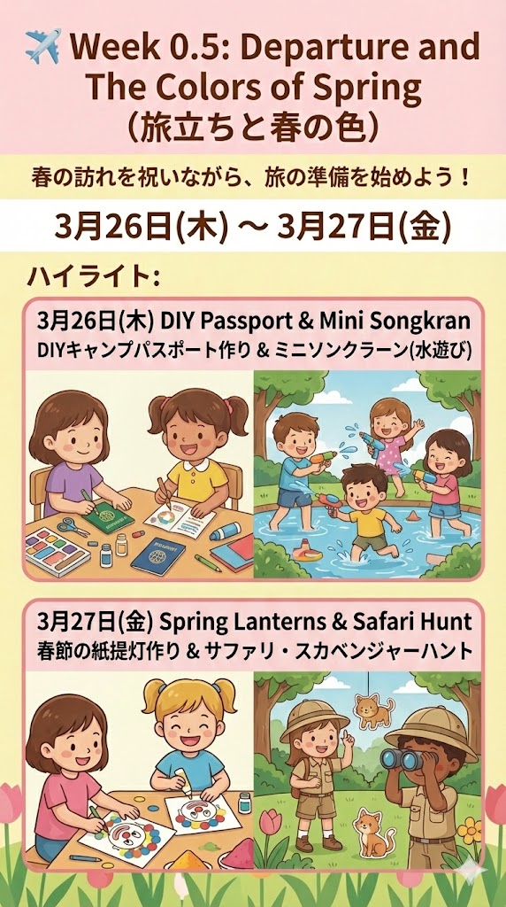 Spring Camp Week 0.5の案内。タイトル「Week 0.5: Departure and The Colors of Spring(旅立ちと春の色)」、日程「3月26日(木) ~ 3月27日(金)」。ハイライトとして、子供たちが机でパスポートを作成しているイラスト「DIY Camp Passport: 自分だけのパスポートを作成!」と、チューリップ畑の前で子供たちが折り紙のチューリップを作っているイラスト「Colors of Spring: オランダの「チューリップ・フェスティバル」をイメージした折り紙クラフトなど、春の色を探しに行こう。」が描かれている。